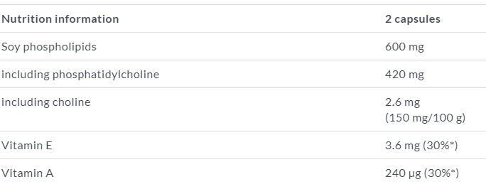 Ingrédients: phospholipides de soja - choline, phosphatidylcholine, vitamine E, vitamine A