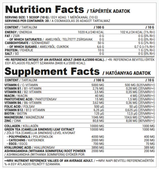 Non seulement le produit a une teneur très élevée en ingrédient actif qui lui a donné son nom, l'acide hyaluronique, mais pour être complet, nous avons également ajouté d'autres ingrédients actifs favorisant la beauté*, tels que complexe de vitamines B, zinc, extrait d'ashwagandha, collagène et vitamine C !