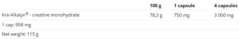 Kre-Alkalyn est une forme tamponnée de créatine avec un alcali, avec un pH en solution aqueuse compris entre 12 et 14. Kre-Alkalyn est une créatine ramollie qui ne se transforme pas en créatinine lorsqu'elle pénètre dans le corps humain. Kre-Alkalyn est stabilisé, il traverse donc le système digestif sans être modifié et peut être entièrement absorbé par le système musculaire.