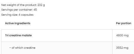 Mode d'emploi : prendre ( 1 dose = 4 gélules ) de OstroVit Malate de tricréatine/TCM 1250 mg les jours d'entraînement avant l'entraînement et les jours de repos, prendre 1 dose le matin à jeun.