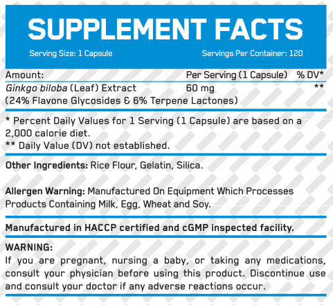 Important : Avant de commencer à prendre du Ginkgo Biloba, consultez un médecin, surtout si vous avez des antécédents médicaux ou si vous prenez des médicaments. Ce produit est déconseillé aux femmes enceintes ou allaitantes.