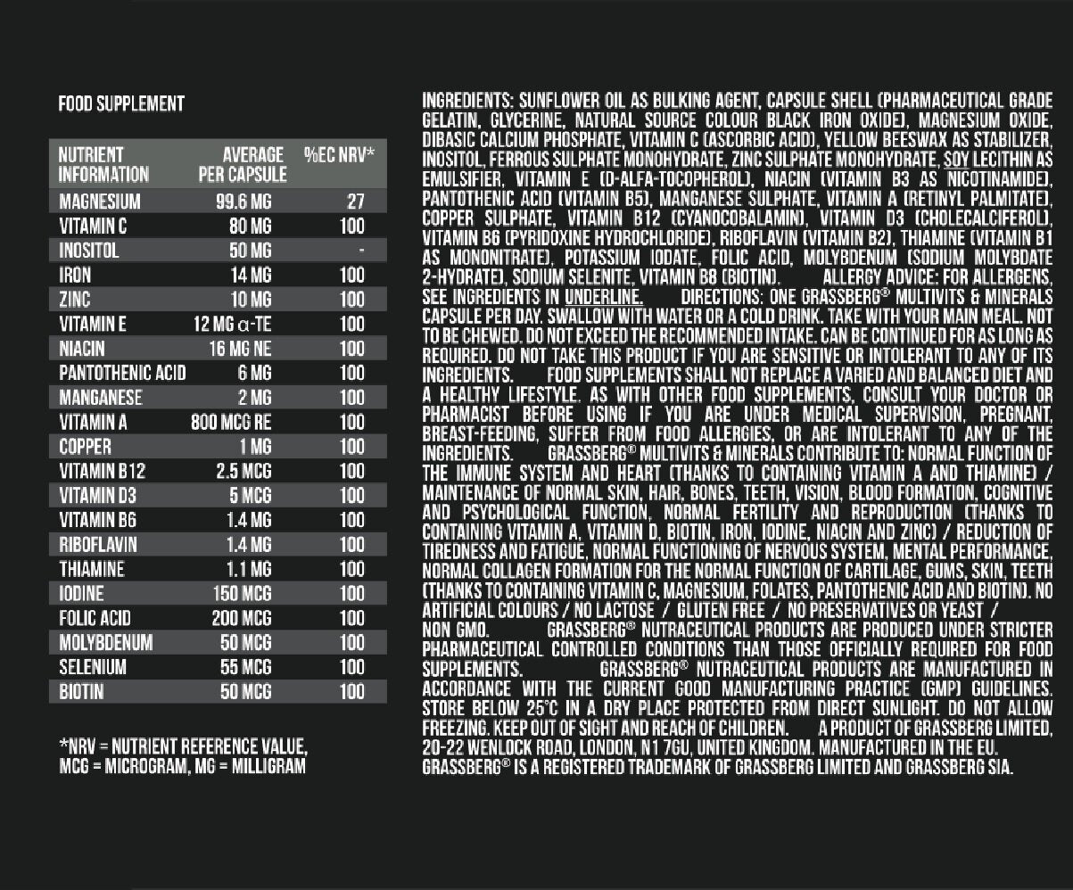 Grassberg Multivits & Minerals se présente sous forme de capsules molles, plus faciles à avaler et à absorber plus rapidement.