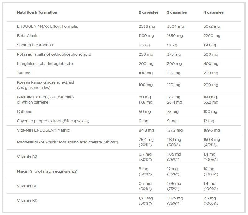 Ingrédients: Bêta-alanine, bicarbonate de sodium, sels de potassium de l'acide orthophosphorique, L-arginine alpha-cétoglutarate, oxyde de magnésium, taurine, extrait de ginseng coréen, extrait de guarana (Paullinia cupana), caféine, extrait de poivre rouge et noir (Capsicum annuum), bisglycinate de magnésium (chélate d'acide aminé de magnésium Albion®), vitamines B2, B6, B12
