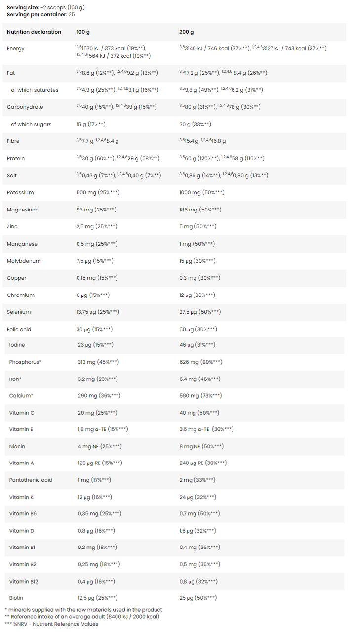 Instructions: Prendre 1 à 2 fois par jour en dissolvant 100 grammes de produit dans 300 à 350 ml d'eau, de lait ou de votre boisson préférée. À consommer après l'entraînement pour une absorption plus rapide des macronutriments essentiels à la récupération.