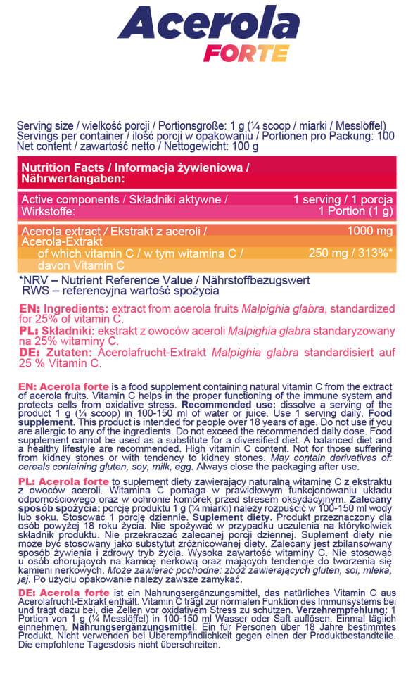 Il est important de noter qu'avant d'utiliser Acerola Forte, il est conseillé de consulter un médecin, surtout si vous avez des allergies ou souffrez de problèmes de santé spécifiques.