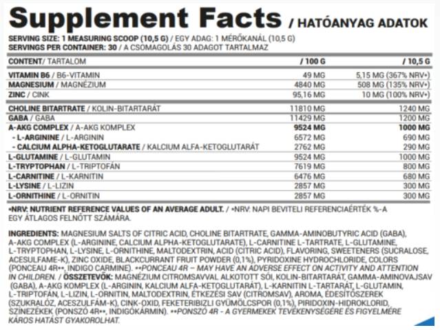 D’une part, le produit contient une grande quantité d’acide aminé GABA et l'acide aminé L-tryptophane , qui est un précurseur de mélatonine , l'hormone du sommeil, présente dans notre corps. Parmi les acides aminés, elle contient également L-glutamine et L-carnitine et est complété par deux combinaisons d'ingrédients actifs, la combinaison de L-lysine , L-ornithine et choline et les oligo-éléments classiques zinc , magnésium et B6 .