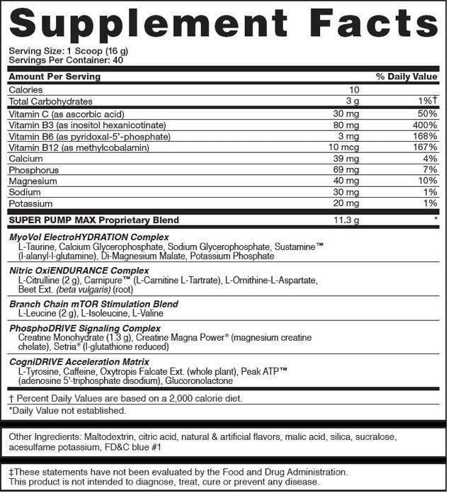 Instructions :En complément alimentaire, prendre 1 à 3 mesures de SuperPump MAX dans 230 à 700 ml d'eau froide ou de jus (i.eEnviron 230 à 240 ml de liquide pour chaque dose de produit, 30 à 40 minutes avant l'entraînement. Important : si vous utilisez le produit pour la première fois, prenez une dose pour les 2 ou 3 premières séances afin de permettre à l'organisme d'absorber correctement les fortes doses de SuperPump MAX. Ce produit est à utiliser uniquement les jours d'entraînement.