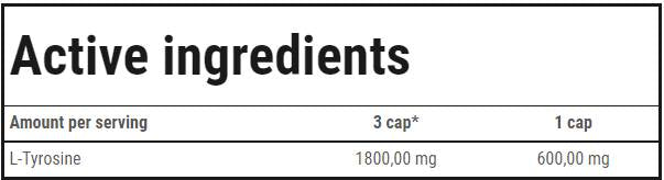 COMPOSITION: L-tyrosine (82,8 %) ; enveloppe de la capsule (gélatine ; colorant – dioxyde de titane) ; antiagglomérant – sels de magnésium d’acides gras.