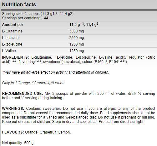 Glutamine - l'acide aminé le plus abondant dans le corps humain. La glutamine est directement impliquée dans les processus anaboliques et son absence entraîne fatigue et dégradation musculaire. La glutamine prévient la perte de masse musculaire lors d'entraînements intensifs, de maladies et de stress. Elle réduit également efficacement le cortisol ;
