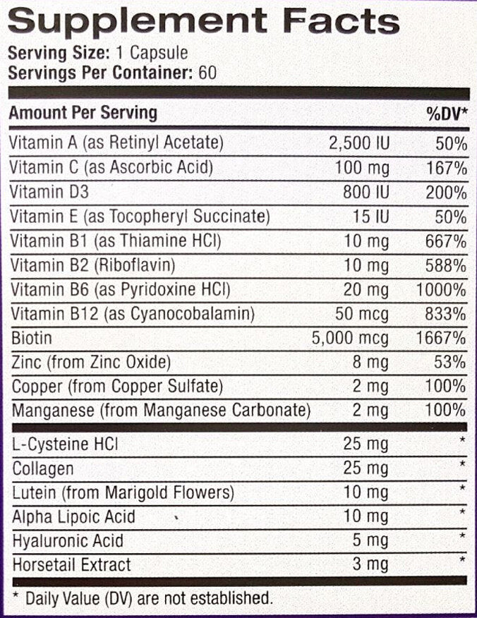 Ingrédients: Vitamines A, D3, C, E, B1, B2, B6, biotine, zinc, magnésium, collagène, lutéine, acide hyaluronique