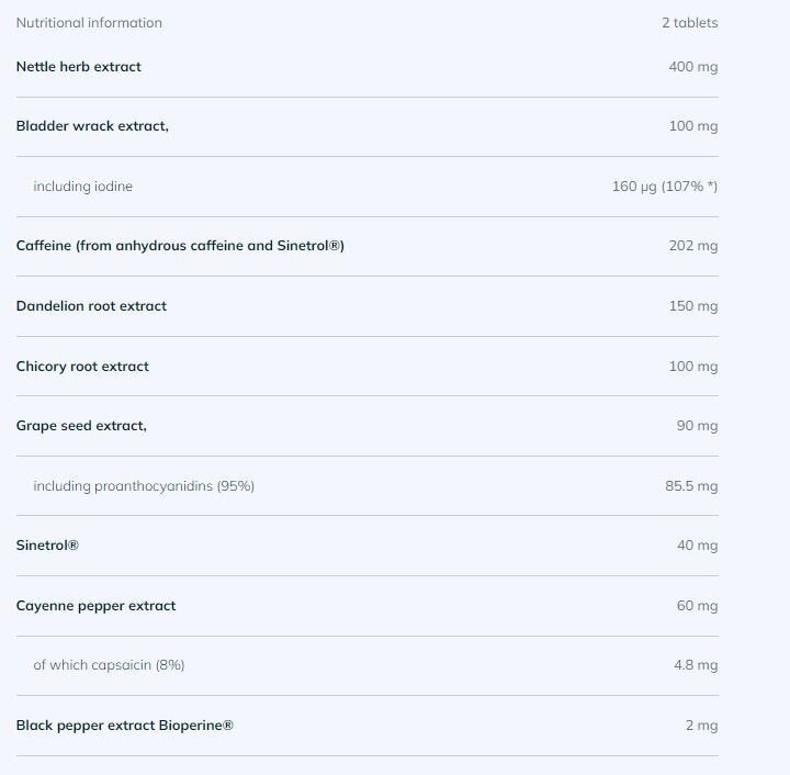 Ingrédients: agent de charge – cellulose microcristalline ; extrait d'ortie (Urtica dioica L.), caféine anhydre, extrait de racine de pissenlit (Taraxacum officinale), extrait de fucus vésiculeux (Fucus vesiculosus L.), extrait de racine de chicorée (Cichorium intybus L.), extrait de pépins de raisin (Vitis vinifera L., 95 % de proanthocyanidines), agents d'enrobage – alcool polyvinylique (PVA), polyéthylène glycol, talc, silicate d'aluminium et de potassium, monooléate de polyoxyéthylène sorbitane ; extrait de piment (Capsicum annum L.) ; agent de charge – sel de carboxyméthylcellulose de sodium réticulé ; SINETROL® – extrait breveté d'agrumes et de guarana (Citrus sinensis L. Osbeck, Citrus grandis, Citrus aurantium var. dulcis, Paullinia cupana), antiagglomérants – sels de magnésium d'acides gras, dioxyde de silicium ; Extrait de poivre noir Bioperine® (Piper nigrum L.), colorant alimentaire – dioxyde de titane