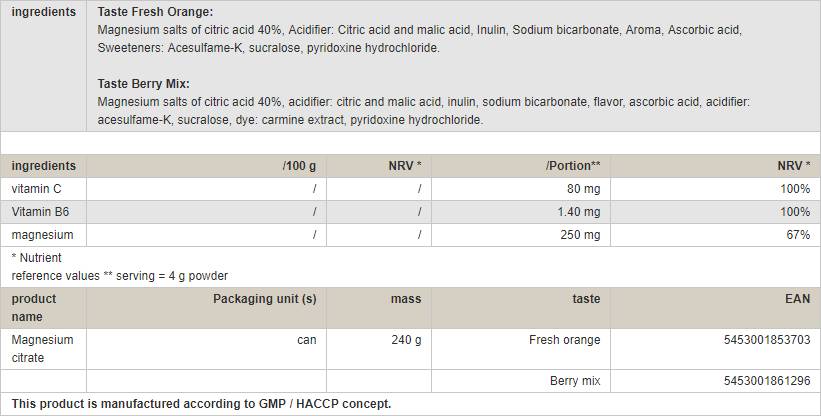 Magnésium (citrate de magnésium) est d’une importance primordiale pour chaque cellule du corps humain. Magnésium (citrate de magnésium) est un minéral nécessaire au métabolisme énergétique, à la synthèse des protéines, à la transmission des impulsions nerveuses à travers les synapses neuromusculaires et à la liaison du calcium aux dents.