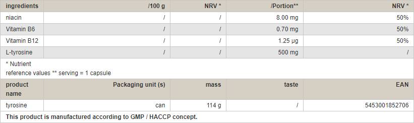 Mode d'emploi : Tyrosine - 1 à 2 capsules par jour, de préférence à jeun avec de l'eau ou du jus.
