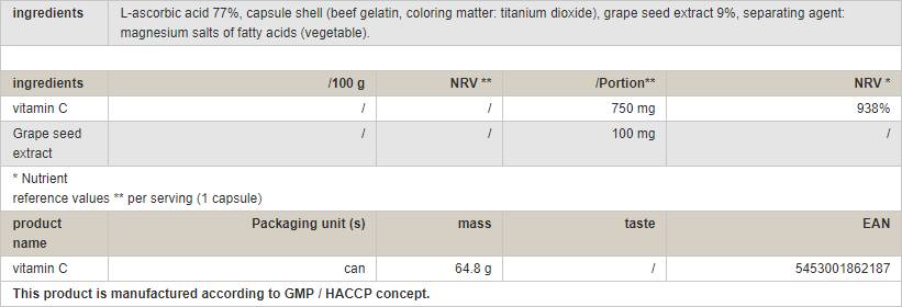 Vitamine C 750 mg/avec grapese - 60 capsules