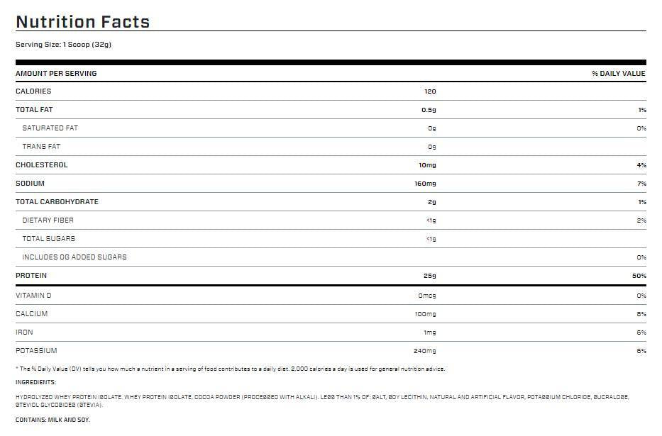 Consultez les statistiques : chaque portion contient 25 grammes de protéines, sans glucides ni lipides. Regardez de plus près. - vous verrez que tout cela est emballé dans une portion de 28 grammes, ce qui fait ISO•100 90 % de protéines ! Rien d’autre ne peut se comparer ou s’approcher de notre formule.