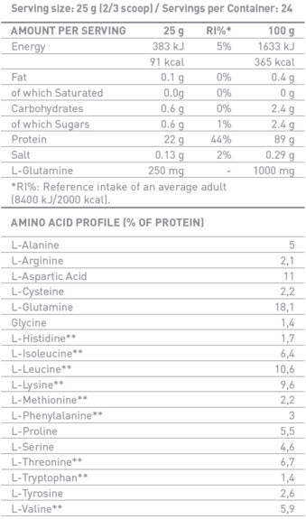 Ingrédients: Isolat et hydrolysat de protéines de lactosérum, L-Glutamine