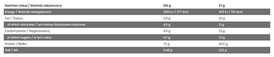 Caséine hydrolysée (PeptoPro®) - est une protéine transformée par des enzymes qui la décomposent en peptides. Les peptides sont les éléments constitutifs des acides aminés et sont les nutriments les plus rapidement digestibles. Des études montrent que PeptoPro fournit le pic de protéines le plus puissant après l'entraînement, parvenant à restaurer le corps en seulement 30 minutes !!!