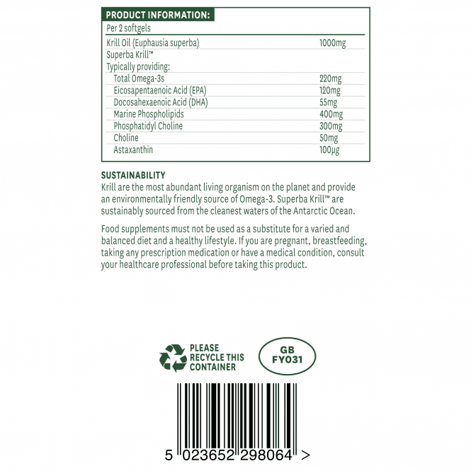 Natures Aid Huile de krill antarctique Superba Extraite du zooplancton des eaux les plus pures de l'océan Antarctique, elle est certifiée par le British Council for Sustainable Sea Basin Development. Capsules molles sans goût ni odeur, faciles à avaler. L'huile de krill est une excellente source d'acides gras oméga-3, dont l'EPA et le DHA. Sa forte concentration en phospholipides la rend plus facilement assimilable par l'organisme que l'huile de poisson, car les acides gras oméga-3 présents dans l'huile de poisson sont généralement stockés sous forme de triglycérides. L'huile de krill contient de la phosphatidylcholine et de l'astaxanthine. La phosphatidylcholine est le principal phospholipide du corps humain, un élément constitutif des membranes cellulaires. Elle intervient dans de nombreux processus corporels, comme le transport des graisses du foie vers la circulation sanguine. Elle contribue à la santé et au bon fonctionnement du foie. L'astaxanthine est un caroténoïde naturel qui, grâce à sa structure unique, offre de nombreux bienfaits antioxydants. Parce que l'astaxanthine traverse les barrières hémato-encéphalique et hémato-rétinienne, elle offre une puissante protection antioxydante directement aux yeux, au cerveau et au système nerveux. Les propriétés anti-inflammatoires des acides gras oméga-3 protègent contre les maladies cardiovasculaires, le cancer et le diabète de type 2. Ils améliorent la circulation sanguine, réduisent le mauvais cholestérol et la tension artérielle, et favorisent la santé des articulations.