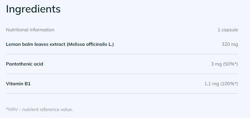 Ingrédients: extrait de feuille de mélisse (Melissa officinalis L.), agent de charge – cellulose microcristalline ; antiagglomérants – sels de magnésium d'acides gras, dioxyde de silicium ; pantothénate de calcium – acide pantothénique, chlorhydrate de thiamine – vitamine B1, capsule (composant de l'enveloppe – gélatine, colorant alimentaire – E 171)