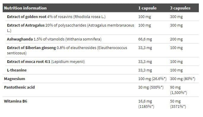Ingrédients: extrait de racine d'or, extrait d'astragale, extrait d'ashwagandha, extrait de ginseng sibérien, extrait de racine de maca, L-théanine, oxyde de magnésium, D-pantothénate de calcium - acide pantothénique, chlorhydrate de pyridoxine (vitamine B6), charge microcristalline, stéarate de magnésium de cellulose - agent antiagglomérant, capsule (gélatine - ingrédient d'enrobage, colorant : E171)
