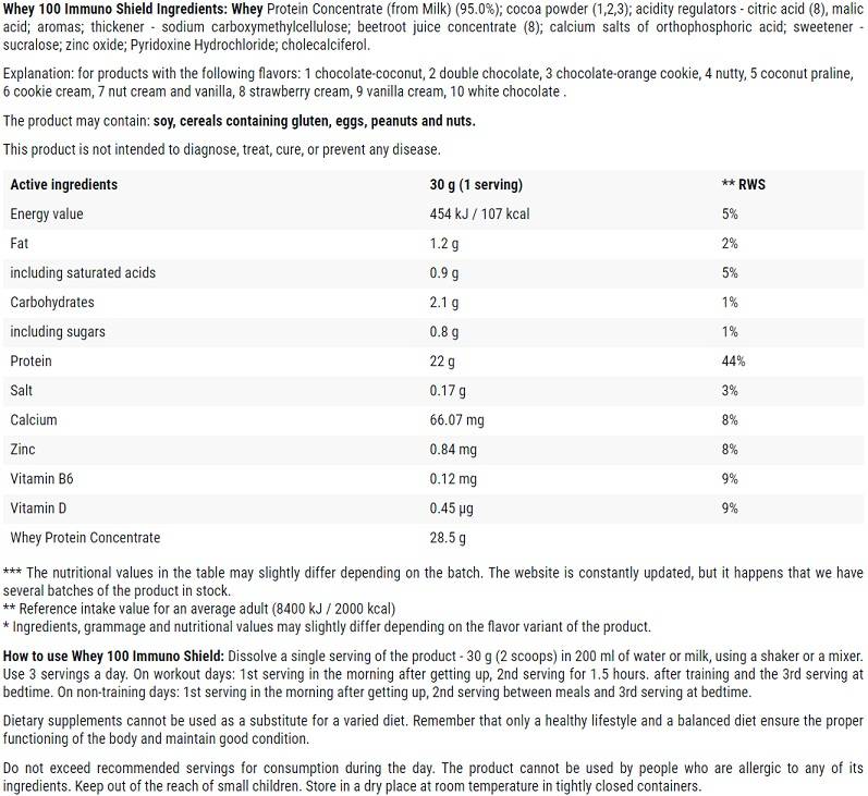 Son contenu est constitué à 100 % de concentré de protéines de lactosérum, d'une pureté supérieure à 80 %. La protéine de lactosérum est l'une des protéines d'origine naturelle les plus populaires et les plus efficaces. Elle présente une valeur biologique élevée (BV104), une excellente solubilité et absorption, ainsi qu'une teneur importante en acides aminés à chaîne ramifiée (BCAA) et en glutamine.