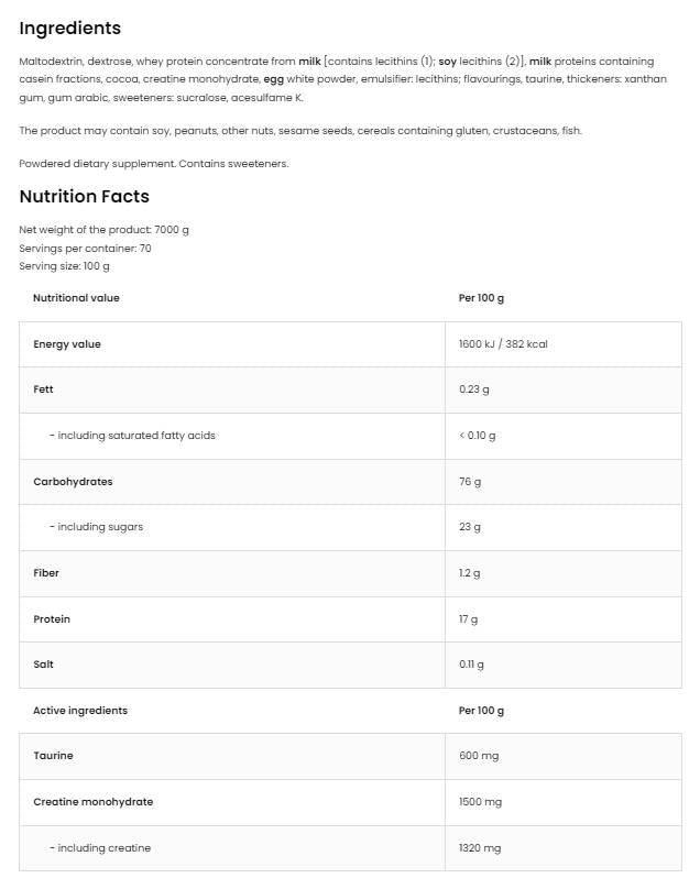 Gainer anabolisant | Gainer de masse avec créatine et taurine 7 000 grammes