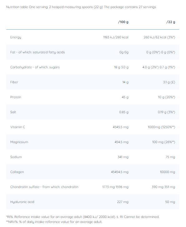 Nous avons également ajouté 390 mg de sulfate de chondroïtine par portion, ce qui favorise l'absorption du collagène et de l'acide hyaluronique et préserve la santé et l'hydratation des articulations et du cartilage. Enfin, nous avons complété le produit avec de l'extrait de racine d'ashwagandha, qui peut avoir un effet positif sur la concentration tout en contribuant à la régénération en relaxant les muscles.