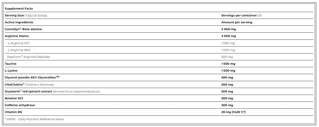 La caféine stimule le système nerveux, augmentant ainsi l'énergie et la motivation pour l'entraînement. La vitamine B6 joue un rôle important dans le métabolisme énergétique et contribue à réduire la fatigue. La bêta-alanine et l'arginine présentes dans la composition contribuent également à améliorer l'endurance et à optimiser la récupération musculaire.