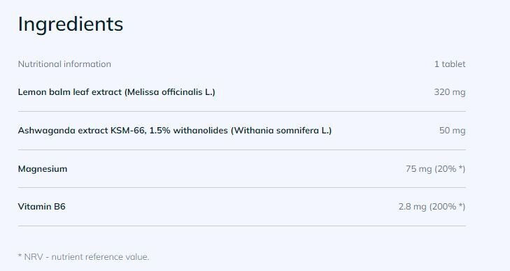 Ingrédients: malate de magnésium, extrait de mélisse (Melissa officinalis l.); cellulose microcristalline (agent de charge); extrait d'ashwagandha (Withania somnifera L.); alcool polyvinylique, polyéthylène glycol, talc (agents d'enrobage); carboxyméthylcellulose sodique réticulée (agent de charge); stéarate de magnésium, dioxyde de silicium (agents antiagglomérants); chlorhydrate de pyridoxine (vitamine B6); dioxyde de titane, bleu brillant FCF, oxyde de fer (colorants).