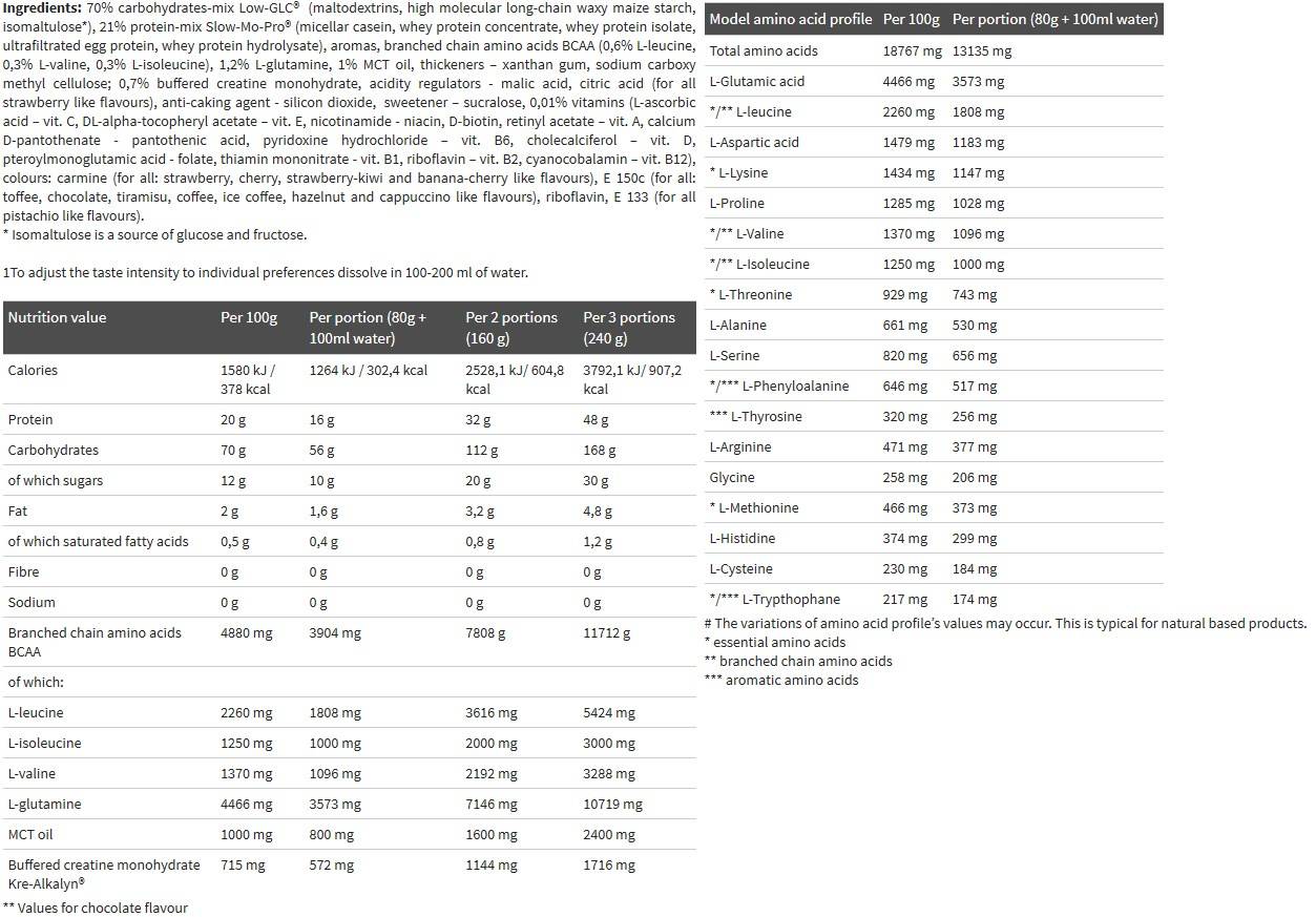 Les glucides à faible teneur en GLC™ fournissent une source d’énergie qui commence seulement 30 minutes après l’ingestion et dure près de 4 heures. Sa prise après l'entraînement permet un apport nutritionnel optimal pour optimiser la reconstruction. L'ajout d'huile MCT et de créatine monohydrate tamponnée ( Kre-Alkalyn® ) vise à améliorer et à minimiser la phase de régénération afin que la croissance post-entraînement se produise sans aucun obstacle.
