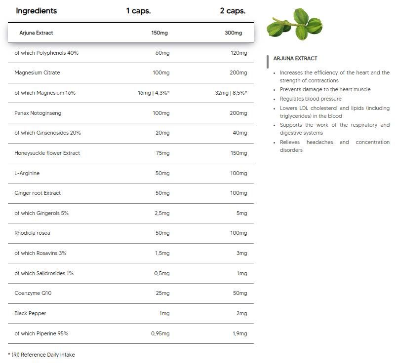 Extrait d'Arjuna (Terminalia arjuna ; dont 40 % de polyphénols), ingrédients de la capsule : cellulose, citrate de magnésium (dont 16 % de magnésium), extrait de Panax Notoginseng (Burkill FHChen ; dont 20 % de ginsénosides), extrait de fleur de chèvrefeuille (4:1), L-arginine, extrait de racine de gingembre (Zingiber officinale ; dont 5 % de gingembre), extrait de Rhodiola rosea (dont 3 % de rOsavins, 1% salidrosides), coenzyme Q10 (ubiquinol).