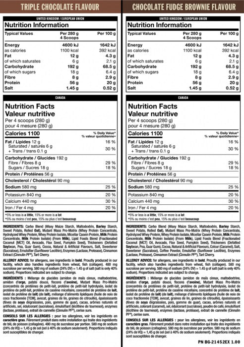 Ingrédients: Mélange de glucides avec maltodextrine, maïs cireux, concentré de protéines de lactosérum, protéines de lactosérum hydrolysées, isolat de protéines de lactosérum, caséine micellaire, concentré de protéines de lait, graines de lin, tryptophane, BCAA, CLA, graisses MCT
