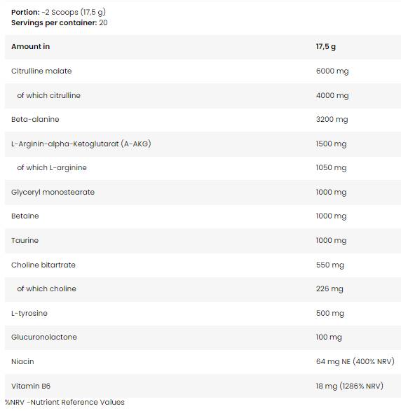 malate de citrulline, bêta-alanine, alpha-cétoglutarate de L-arginine (A-AKG), stabilisant (monostéarate de glycéryle), bétaïne anhydre, taurine, antiagglomérant (E551), correcteur d'acidité (E500(ii)), arômes8, bitartrate de choline, arômes 6,7,11, L-tyrosine, arômes 1,2,3,4,5,9, arôme 10, sel, glucuronolactone, niacine (acide nicotinique), vitamine B6 (chlorhydrate de pyridoxine), concentré de jus de betterave 1,2, 4,5,6,9,10,11, concentré de carotte noire6, édulcorants (acésulfame K, sucralose, glycosides de stéviol de stévia), colorant(s) [(E160a)3,4,5,7,8, (E104)3 , (E132)11]. E104 : Peut avoir un effet indésirable sur l'activité et l'attention chez les enfants.