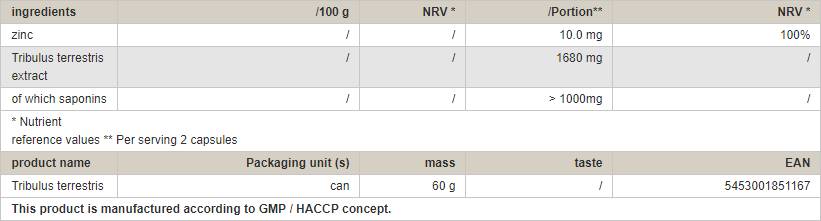 Mode d'emploi : Tribulus Terestis - 1 à 2 capsules par jour, avec du liquide.
