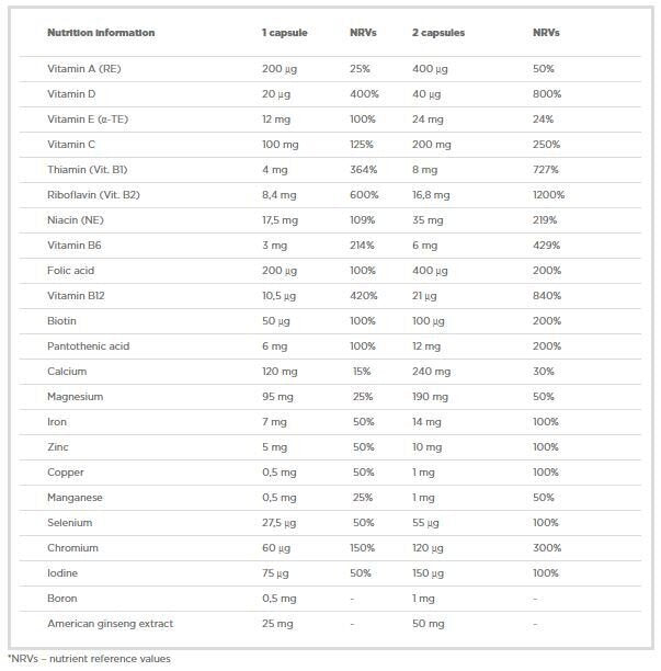 Ingrédients: carbonate de calcium, oxyde de magnésium, acide L-ascorbique - vit. C, agent de charge - cellulose ; acétate de DL-alpha-tocophéryle - vit. E, gluconate de zinc, extrait de racine de ginseng américain (Panax quinquefolius L.), fumarate ferreux, nicotinamide - niacine, cyanocobalamine - vit. B12, riboflavine - vit. B2, acétate de rétinyle - vit. A, cholécalciférol - vit. D, D-pantothénate de calcium - acide pantothénique, sélénite de sodium, gluconate de cuivre, mononitrate de thiamine - thiamine (vit. B1), chlorhydrate de thiamine - thiamine (vit. B1), chlorhydrate de pyridoxine - vit. B6, gluconate de manganèse, acide borique, D-biotine - biotine, chlorure de chrome (III), acide ptéroylmonoglutamique - folate, iodure de potassium, antiagglomérants - dioxyde de silicium, sels de magnésium d'acides gras ; capsule (gélatine, colorant : E 172)