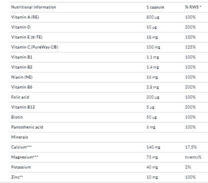 Ingrédients: vitamine A, vitamine D, vitamine E, vitamine C, vitamine B1, vitamine B2, niacine, vitamine B6, acide folique, vitamine B12, biotine, acide pantothénique, calcium (chélate d'acides aminés Albion®, carbonate de calcium), magnésium (chélate d'acides aminés Albion®, oxyde de magnésium, potassium, zinc (chélate d'acides aminés Albion®), fer (chélate d'acides aminés Albion® (Ferrochel®)), manganèse (chélate d'acides aminés Albion®), cuivre (chélate d'acides aminés Albion®), iode, sélénium, extrait de ginseng panax coréen (Panax ginseng L.), dont 7 % de ginsénosides, lutéine, acide hyaluronique